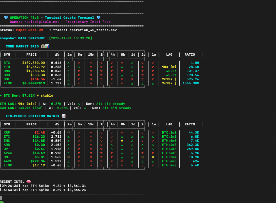 🧠 Built to eliminate emotional trading, Operation 45 turns you into a system — a cold, calculated executor of structure. It scans for high-probability setups, flags key volatility spikes, and visualizes BTC/ALT lag behavior in real-time. You don’t guess. You don’t chase. You wait for confirmation and strike with discipline.